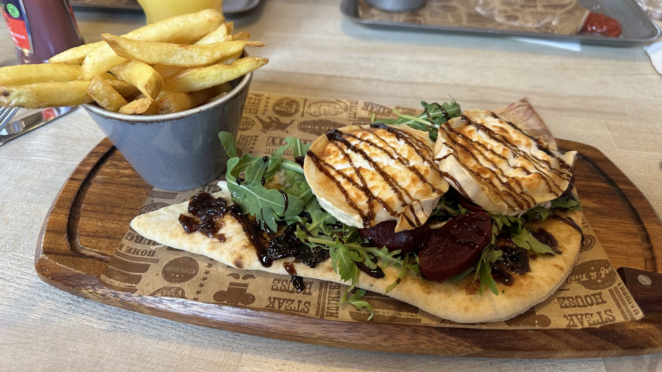 My absolutely fave place to eat is an American western themed restaurant about 15 miles away bear my eldest’s school. We sometimes treat ourselves to breakfast after dropping the boy off, but I really love going for lunch or dinner when we can afford it. Here’s my favourite dish: goats cheese & beetroot flatbread.